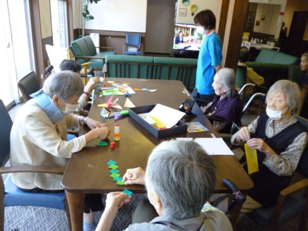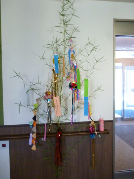 7月23日、七夕飾りを作りました。「字書くの緊張するわ~」「もっと大きく書けばよかったかな~」と、それぞれ短冊に願い事を書いたり、おしゃべりしながら飾りを作ったり、いい時間を過ごしました。