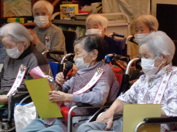 9月17日(水)に敬老会を行いました。米寿、白寿、百寿、101歳以上の長寿の皆さんを対象に花束と職員手作りの色紙でお祝いしました。今年は18名と昨年よりも8名多く、最高齢の方は106歳でした。長生きの秘訣を聞くと「感謝の心が大切」と話してくださいました。