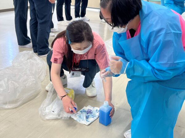 まず、ガウンテクニックを学びました。着脱の手順をしっかり教えていただき、何気なくやっていた行動が、実は汚染を拡大させることにつながっていたことがわかり、とても勉強になりました。吐物処理については、物品を1回分ずつに分けて準備し、使い切り、その都度破棄していくよう指導を受け、今後実践していくことになりました。手順についても丁寧に教えていただき、実践することで理解が深まりました。一人ではできないため、チームワークがとても重要であると実感しました。