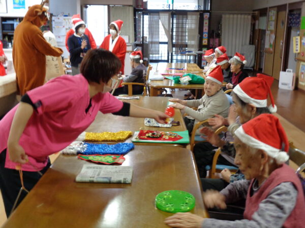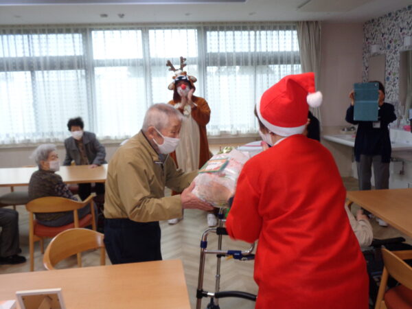 12月24日(水)にミニクリスマス会を行いました。 今年はサンタさん達が各フロアを回りクリスマスプレゼントをお渡ししました。大きな箱からはかわいいサンタさんが登場し会場は大盛り上がりでした。 その後は一緒に歌を歌ったり写真撮影をしました。たくさんの利用者さんの笑顔が見られ、中には笑いすぎで涙を浮かべる方もおられました。これからも元気にお過ごしいただいてまた来年お会いしましょう。