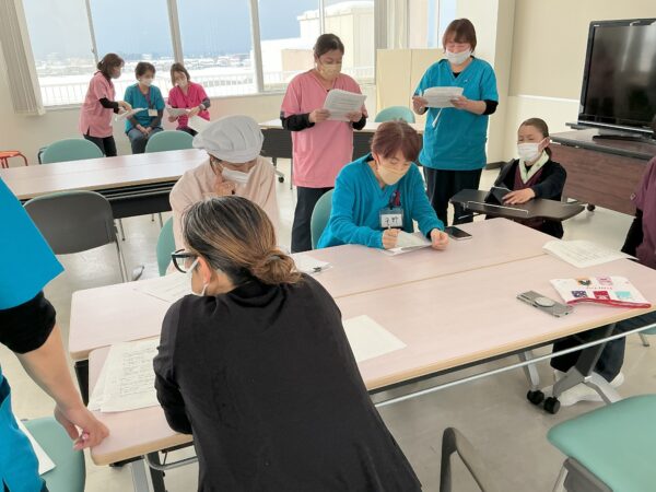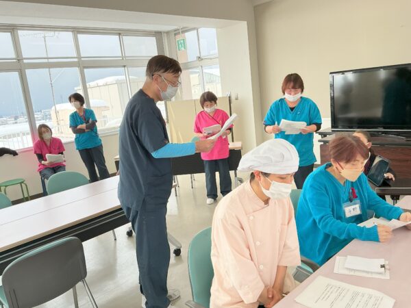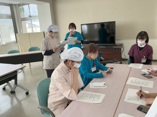 3つのグループに分かれて、グループワークで考えてもらいました。各グループに解答を発表してもらいました。リモートでも行い、皆さん活発に意見交換されていました。発表後、委員が解説を行い、理解を深めてもらいました。曖昧だったところも、みんなで話しをすることで、基本的な知識がしっかり身についたと思います。今後もこのような研修を行い、スタッフの理解を深めていけたら良いのではないかと思いました。感染対策委員会